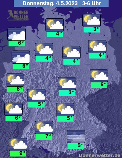 In der Nacht zum Donnerstag zeigt sich der Himmel im Süden oft sternenklar, sonst ist es meist gering oder wechselnd, im Nordwesten im Verlauf auch teils stark bewölkt. Es bleibt trocken bei Tiefstwerten von 9 Grad in Freiburg und etwa 3 Grad in Jena.