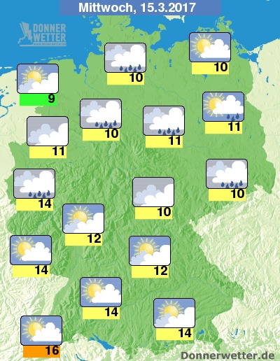 Am Mittwoch verlagert sich das von West nach Ost gestreckte Regenband vom Norden über die breite Landesmitte, dabei fällt gebietsweise leichter Regen, im Norden klingen die Niederschläge im Tagesverlauf wieder ab und es lockert auf. Der Süden zeigt sich meist leicht oder aufgelockert bewölkt und trocken. Die Temperatur steigt auf 9 Grad in Ostfriesland und bis 16 Grad im Breisgau.