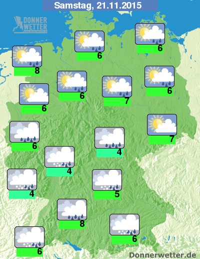 Am Samstag bleibt es vom Süden bis in die breite Mitte des Landes bei einer weitgehend verschlossenen Wolkendecke, dazu fällt besonders am Alpenrand, aber auch sonst zeitweise Regen oder Schneeregen, vor allem in höheren Lagen ist auch Schneefall möglich, dazu besteht erhöhte Glättegefahr. In Norddeutschland ist es oft stark, gelegentlich aber auch aufgelockert bewölkt, es bilden sich gebietsweise Schauer. Die Temperatur steigt auf 4 Grad im Saargau und bis 8 Grad in Stuttgart. An der Nordsee weht teils starker bis stürmischer Wind.