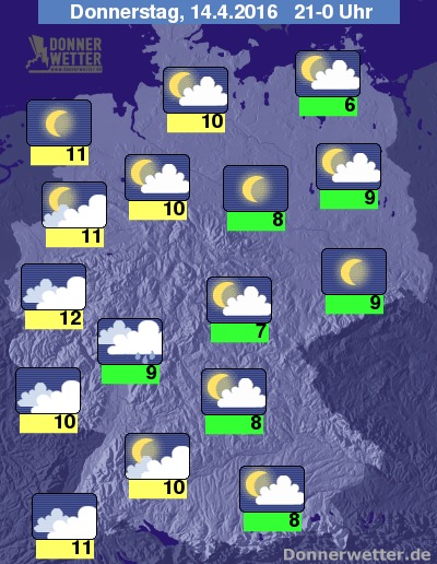 In der Nacht zum Freitag ist es im Norden und Osten zunächst sternenklar oder locker bewölkt, über der Südwesthälfte ist es schon meist dicht bewölkt und zunächst fällt im Südwesten zeitweise Regen, der sich im Nachtverlauf nordostwärts ausbreitet und gegen Morgen etwa einen Streifen von Schleswig-Holstein bis zum westlichen Erzgebirge erreicht. Im Osten und Nordosten nimmt die Bewölkung zwar zu, hier bleibt es aber noch weitgehend trocken. Die Temperatur sinkt auf 10 Grad in Aachen und bis 4 Grad in Vorpommern.