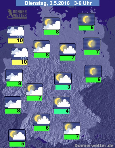 In der Nacht zum Dienstag bleibt der Himmel über der Osthälfte Deutschlands überwiegend sternenklar. Von Westen ziehen jedoch dichte Wolken in die westlichen Landesteile und in der zweiten Nachthälfte setzt hier zeitweiliger Regen ein. Am Alpenrand bleibt es die Nacht durch meist stark bewölkt und es sind weiterhin Schauer möglich. Die Temperatur sinkt auf 10 Grad entlang der Ems und etwa 3 Grad im Vogtland.