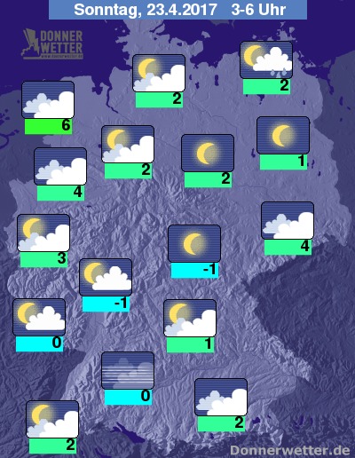 In der Nacht zum Sonntag fällt am Alpenrand noch hier und da Regen, Schneeregen oder Schnee, einzelne Schauer sind auch im Ostseeumfeld möglich. Im großes Rest der Republik zeigt sich der Himmel über dem Land jedoch meist leicht bis aufgelockert bewölkt, von der Mitte des Landes bis nach Osten hin ist es oft sternenklar. Dabei bleibt es trocken. Die Temperatur sinkt auf 6 Grad an der Nordsee und bis -1 Grad am Westerwald.