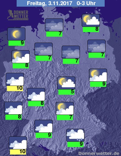 In der Nacht zu Freitag bestimmen zunächst dichte Wolken das Bild am Himmel und am Alpenrand regnet es auch noch vereinzelt. Im Lauf der Nacht trocknet es jedoch landesweit ab und es klart langsam auf. In der Nordhälfte bildet sich gegen Morgen stellenweise Nebel.