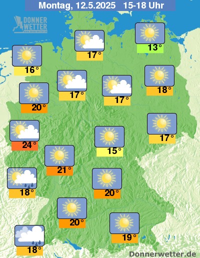 Am Montagnachmittag zeigt sich der Himmel über weiten Landesteilen heiter oder die Sonne scheint von einem wolkenlosen Himmel. Im Südwesten ist es am Nachmittag wolkiger, zum Abend hin können hier auch einzelne Schauer und Gewitter nicht ausgeschlossen werden. Sonst bleibt es trocken.
