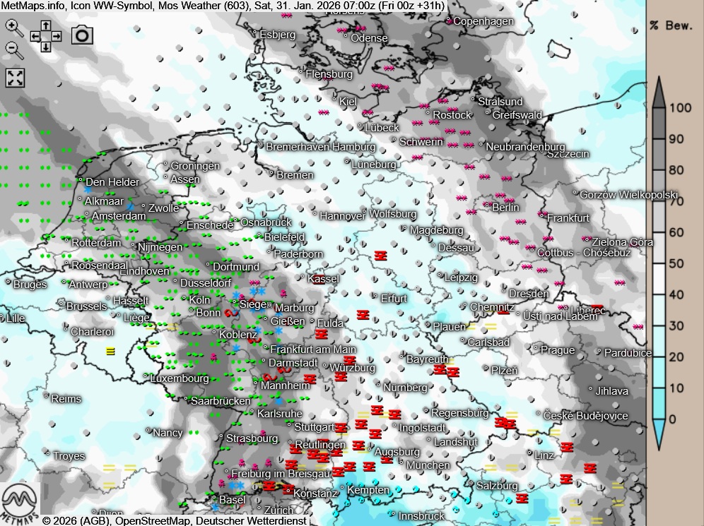 Am Samstag ist es meist wechselnd oder stark bewölkt, zwischendurch kann es aber auch sonnige Abschnitte geben, besonders in Richtung der Alpen. In der westlichen Landeshälfte sind vereinzelt leichte Niederschläge möglich, meist als Regen oder Nieselregen. Stellenweise kann es zu Glatteis kommen, vor allem in den frühen Morgenstunden.