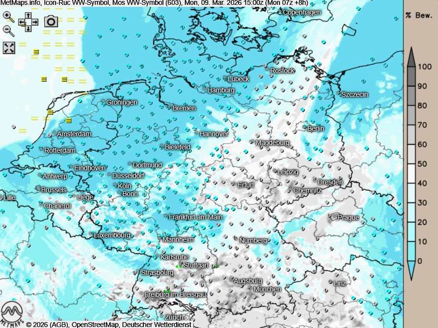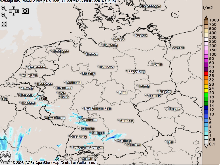 Die Temperatur- / und Wetterkarte für 15:00 Uhr sowie die 6-Stunden-Regenmengen bis 21:00 Uhr nach Icon-Ruc: