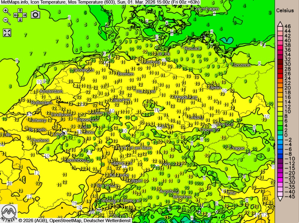 Spitzenwerte um 10 bis 15 Grad.