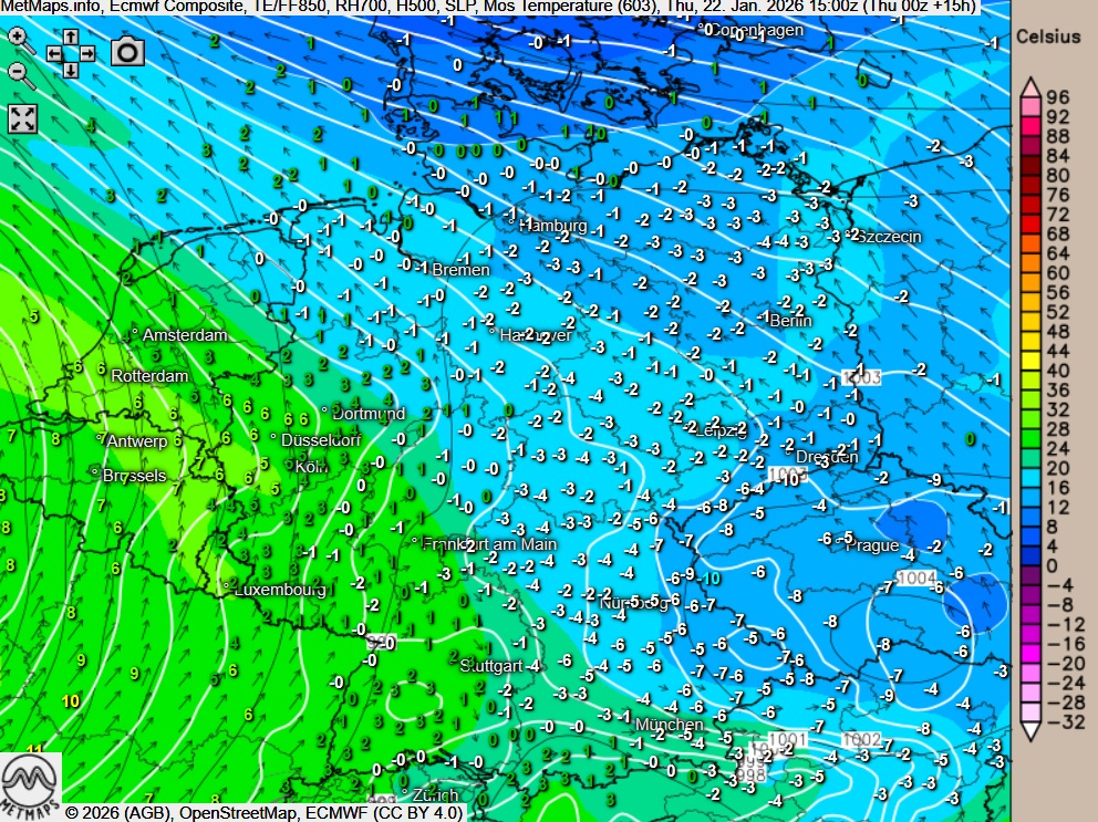 Die Temperaturen erreichen im Dauernebel teils nur Höchstwerte um Um -6 Grad, die mildesten Werte werden mit +6 Grad am Niederrhein erreicht.