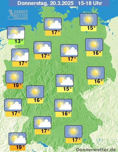 Am Donnerstagnachmittag zeigt sich der Himmel über dem Osten und Südosten sonnig. In den übrigen Landesteilen verlaufen die Nachmittagsstunden teils heiter, teils wolkig; im Westen kann gebietsweise auch mal dichtere Bewölkung durchziehen. Es bleibt trocken.