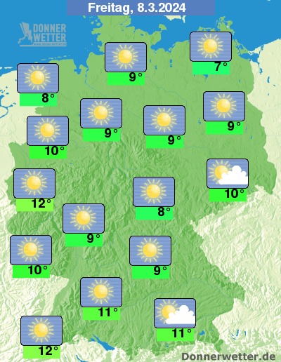Die Temperaturen erreichen am Nachmittag Höchstwerte um 7 Grad in Küstennähe, 9 Grad an der Weser und 12 Grad am Oberrhein.