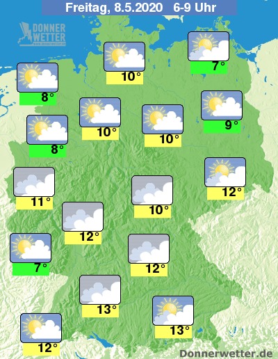 Der Freitag startet in der Nordhälfte mit einem Mix aus Sonne und Wolken, auch im Südwesten und an den Alpen ist es teils heiter, teils locker bewölkt. Im Süden und Westen ist es regional auch stark bewölkt oder bedeckt. Es bleibt trocken.