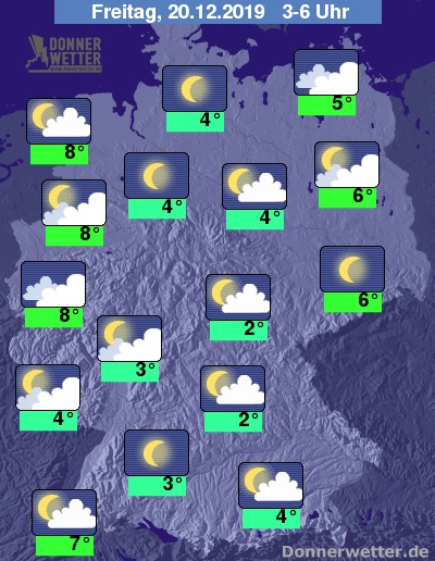 Bis zu den Frühstunden kühlt die Luft auf 2 bis 8 Grad ab, stellenweise kann es leichten Bodenfrost geben, am mildesten bleibt es an Niederrhein und Ems.