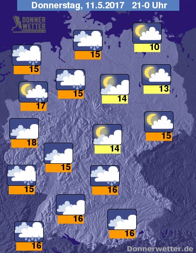 Zudem wird die Nacht deutlich milder als noch die vorangegangenen Nächte. Die Tiefstwerte liegen zwischen 6 Grad an der Ostsee und 12 Grad am Niederrhein.