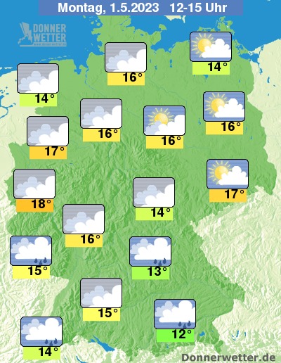 Heute Nachmittag ist es im Osten und Nordosten noch oft aufgelockert, im übrigen Land dagegen verbreitet stark oder dicht bewölkt. Im Süden, Südwesten und im äußeren Westen bilden sich gebietsweise Schauer. Im übrigen Land bleibt es noch trocken bei Werten von 12 Grad in Oberbayern und 18 Grad im Rheinland.
