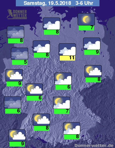 In der Nacht zum Samstag ist es vor allem westlich des Rheins meist sternenklar, sonst ist es über dem Land teils locker, teils aufgelockert bewölkt, über der Norddeutschen Tiefebene halten sich auch verbreitet dichte Wolken, dazu bleibt es aber trocken. Die Temperatur sinkt auf 11 Grad in Magdeburg und bis 5 Grad am Niederrhein.