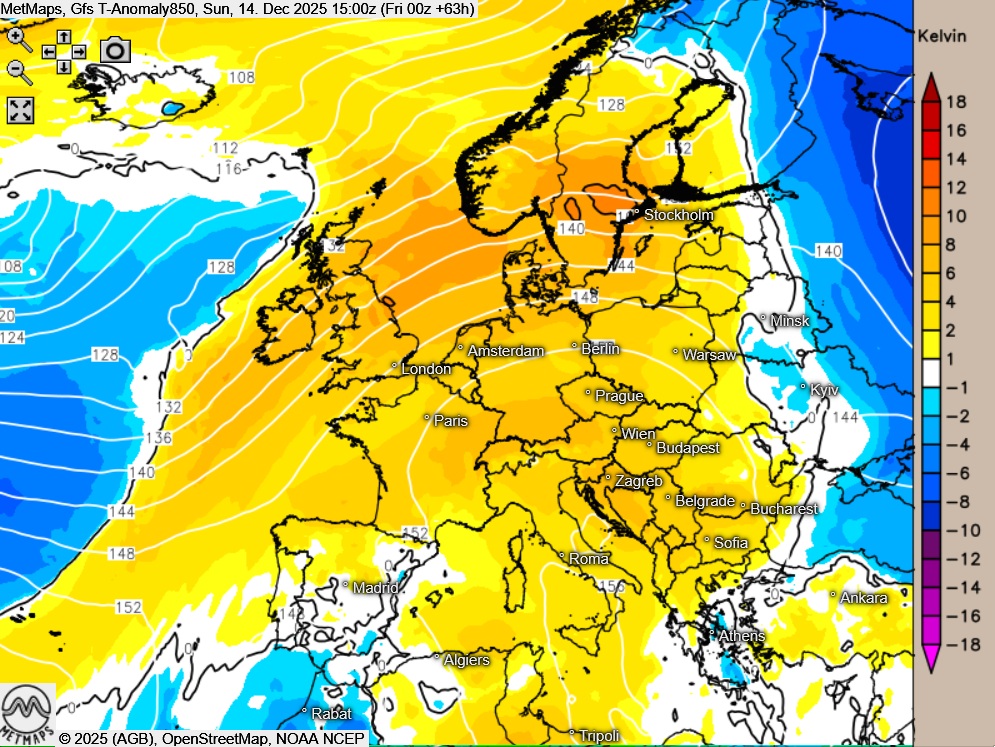 Die Wetterkarte sowie die Temperaturabweichung in Europa am Sonntagnachmittag (15:00 Uhr) nach GFS: