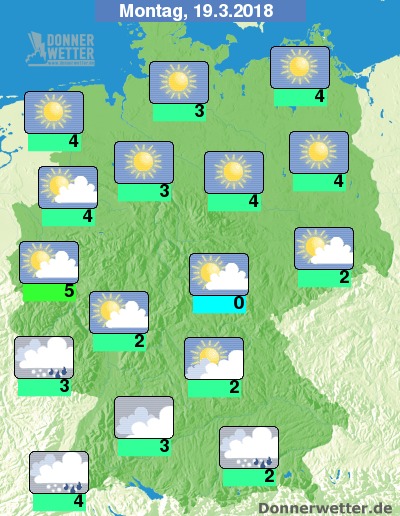Im Alpenvorland und im Südwesten dominieren meist die Wolken. Gelegentlich fällt noch etwas Schnee oder Schneeregen. Sonst stellen sich im Tagesverlauf einige Aufheiterungen ein. Im Norden scheint wieder längere Zeit die Sonne von einem nahezu wolkenlosen Himmel. Die Höchsttemperaturen bewegen sich zwischen -2 und 6 Grad. Der Nordost- bis Ostwind weht gebietsweise noch mäßig und lässt einem die Luft noch kälter empfinden als sie ist. In der Nacht auf Dienstag droht verbreitet wieder mäßiger, über einer Schneedecke teilweise auch strenger Frost von unter -10 Grad.
