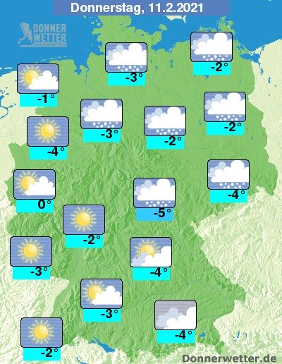 Am Donnerstag ist das Wetter über den westlichen Landesteilen zumeist heiter bis sonnig und dabei trocken. Weiter nach Osten hin werden die Wolken zunehmend dicht und es fällt auch gebietsweise Schnee. Die Temperatur steigt auf -5 Grad in Erfurt und bis etwa 0 Grad in Köln.