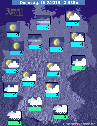 In den frühen Morgenstunden des Dienstag klart es im Nordwesten stellenweise auf, entlang der Weser kann sich vereinzelt Nebel bilden. Im restlichen Bundesgebiet überwiegt lockere oder aufgelockerte Bewölkung, im Süden Bayerns und Baden-Württembergs schneit es, 2 bis -6 Grad.