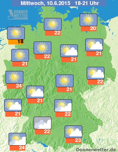 Die Temperaturen liegen am Abend bei Werten um 18 Grad C in Ostfriesland und um 24 Grad C in Köln.