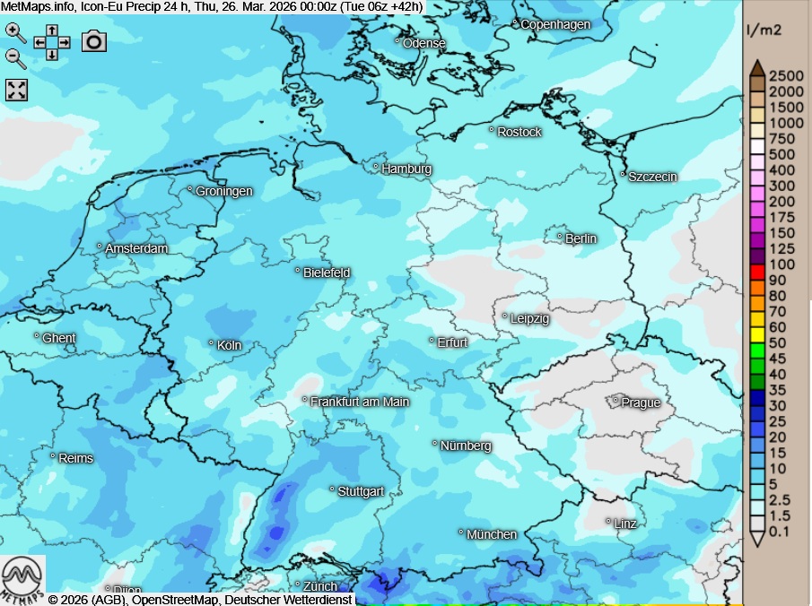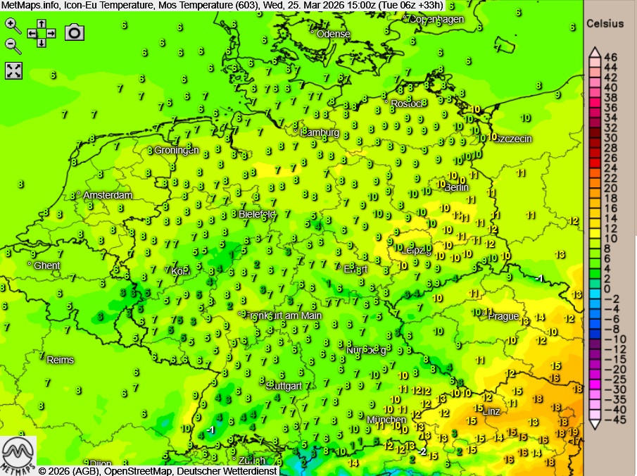 Am Mittwoch zeigt sich das Wetter zunächst noch zweigeteilt: Im Südosten beginnt der Tag teils heiter und trocken, während sich in den übrigen Regionen dichte Wolken halten. Im Tagesverlauf kommt es verbreitet zu wiederholten Regen- und Graupelschauern sowie einzelnen Gewittern, die sich allmählich südwärts und ostwärts verlagern. Im Süden setzt ab den Mittagsstunden zudem länger anhaltender Regen ein.