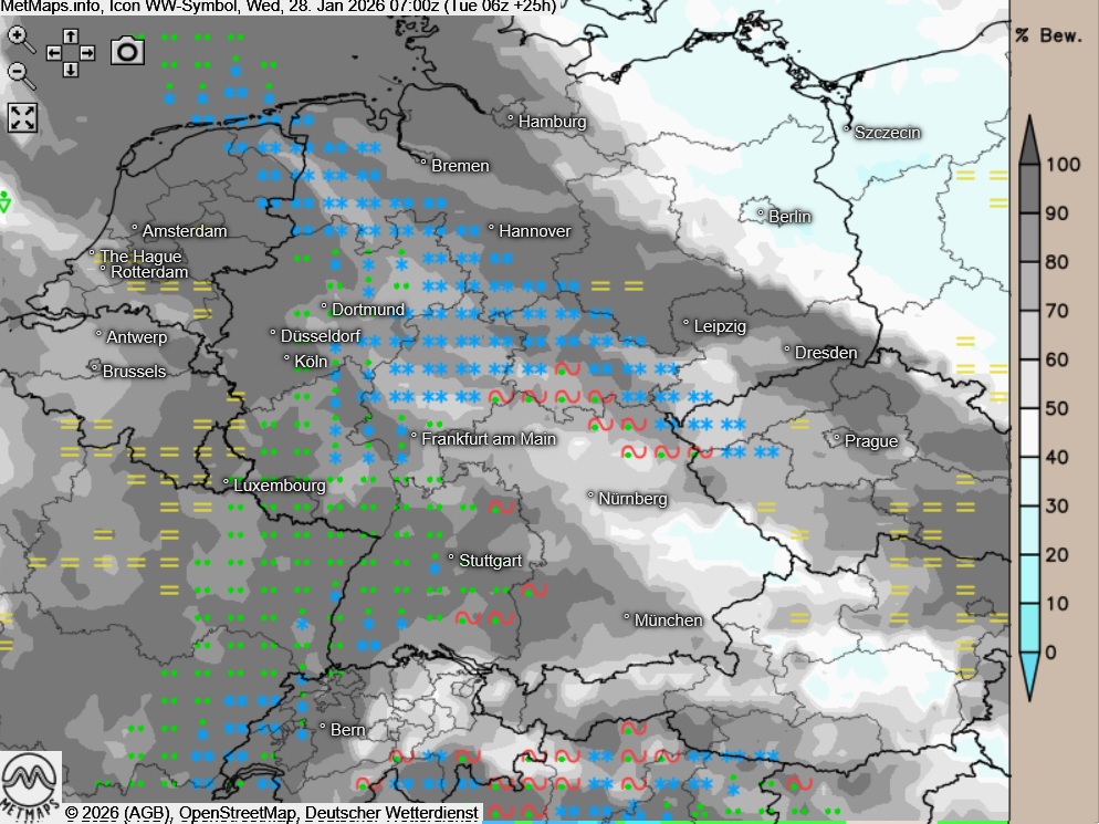 Am Mittwoch zeigt sich der Himmel über weiten Landesteilen bedeckt. Im Nordosten und Südosten bleibt es dabei größtenteils trocken. In den übrigen Regionen fällt zeit- und gebietsweise Niederschlag: In den tieferen Lagen des Westens und Südwestens meist als Regen, sonst häufig als Schnee. In den Mittelgebirgen besteht vor allem zu Tagesbeginn erhöhte Glättegefahr durch gefrierenden Regen.