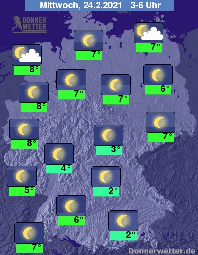 In der folgenden Nacht ist es rund um die Küsten oft locker oder wechselnd bewölkt, im übrigen Bundesgebiet ist es hingegen verbreitet sternenklar. Es bleibt landesweit trocken bei Tiefstwerten von 8 Grad an der Ems und bis etwa 2 Grad im Berchtesgadener Land.