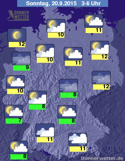 In der kommenden Nacht ist es über dem Südosten der Republik meist bedeckt und es fällt zeitweise Regen. Im übrigen Bundesgebiet ist es hingegen zumeist nur locker bewölkt oder sogar sternenklar, zeitweise können aber auch dichtere Wolken durchziehen, die jedoch nur selten etwas Regen bringen. Stellenweise bildet sich Nebel. Die Temperatur sinkt auf 12 Grad in Berlin und etwa 7 Grad am Pfälzer Wald.