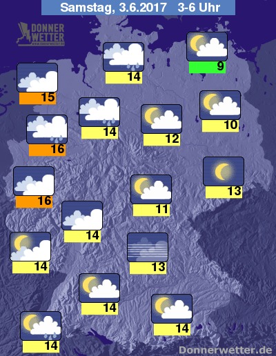 In der folgenden Nacht zeigt sich der Himmel über der Westhälfte des Landes häufig stark und sonst aufgelockert bewölkt, dabei sind vor allem in der ersten Nachthälfte Schauer und regional auch Gewitter möglich. Weiter nach Osten hin bleibt es bei meist nur leicht bewölktem oder sternenklarem Himmel verbreitet trocken. Die Temperatur sinkt auf 16 Grad in Düsseldorf und bis 9 Grad in Stralsund.