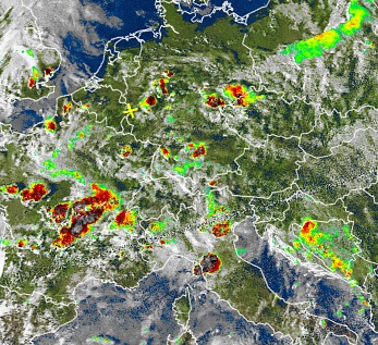 Auf unserem Satbild sind die Gewitter farblich gut zu sehen. Mehr Satellitenbilder finden Sie hier.