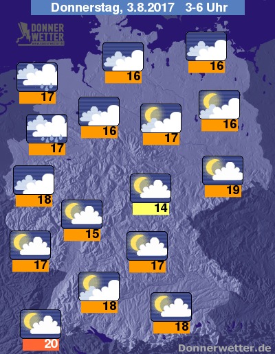 Am Donnerstag zeigt sich besonders der Norden, oft jedoch auch der Westen der Bundesrepublik stark bewölkt, dazu bilden sich hier einzelne Schauer oder es regnet gebietsweise. In den anderen Landesteilen ist es hingegen oft heiter, zum Teil sogar sonnig, dazu besteht jedoch ein leichtes bis mäßiges Schauer- und Gewitterrisiko. Die Temperatur steigt auf etwa 20 Grad an der Nordsee und bis 33 Grad in München.