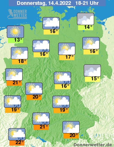 Heute Abend zeigen sich teils Auflockerungen, teils ziehen kompakte Wolken durch, es können sich weiterhin einzelne Schauer, selten auch Gewitter bilden. Die Temperatur liegt bei 13 Grad in Cuxhaven und etwa 22 Grad in Freiburg.