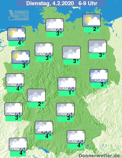 Der Dienstag startet mit dichten Wolken, einzelne Lichtblicke beschränken sich vor allem auf die Küstenregionen. Verbreitet muss in den Frühstunden mit Niederschlägen gerechnet werden, die vielerorts von Regen in Schneeregen oder Graupel, oberhalb von 500 bis 700 m auch in Schnee übergehen. Vorsicht, Glättegefahr!