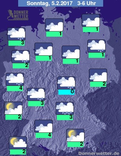 In der folgenden Nacht zieht ein breites Niederschlagsband von der Südwesthälfte der Republik weiter in den Norden und Osten, es schwächt sich dabei jedoch ab, so dass über dem Norden und Osten dann nur noch gebietsweise Regen fällt. Im Süden und Südwesten klingen die Niederschläge im Verlauf dagegen ab und es lockert nach und nach auf. Die Temperatur sinkt auf 4 Grad in der Kölner Bucht und bis 0 Grad im Vogtland.
