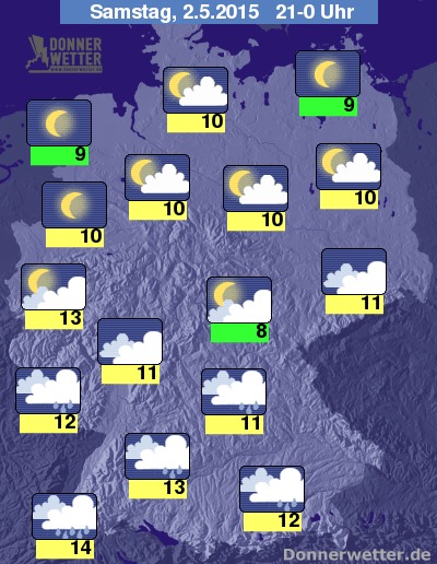 Heute Abend ziehen aus südwestlicher Richtung kompakte Regenwolken in den Süden und Südwesten von Deutschland. In der Landesmitte nimmt die Bewölkung zwar zu, aber hier bleibt es noch weitgehend trocken. In den nördlichen Landesteilen ist es verbreitet locker bewölkt oder sternenklar und es bleibt trocken. Die Abendtemperatur liegt bei 14 Grad in Freiburg und etwa 8 Grad im Vogtland.