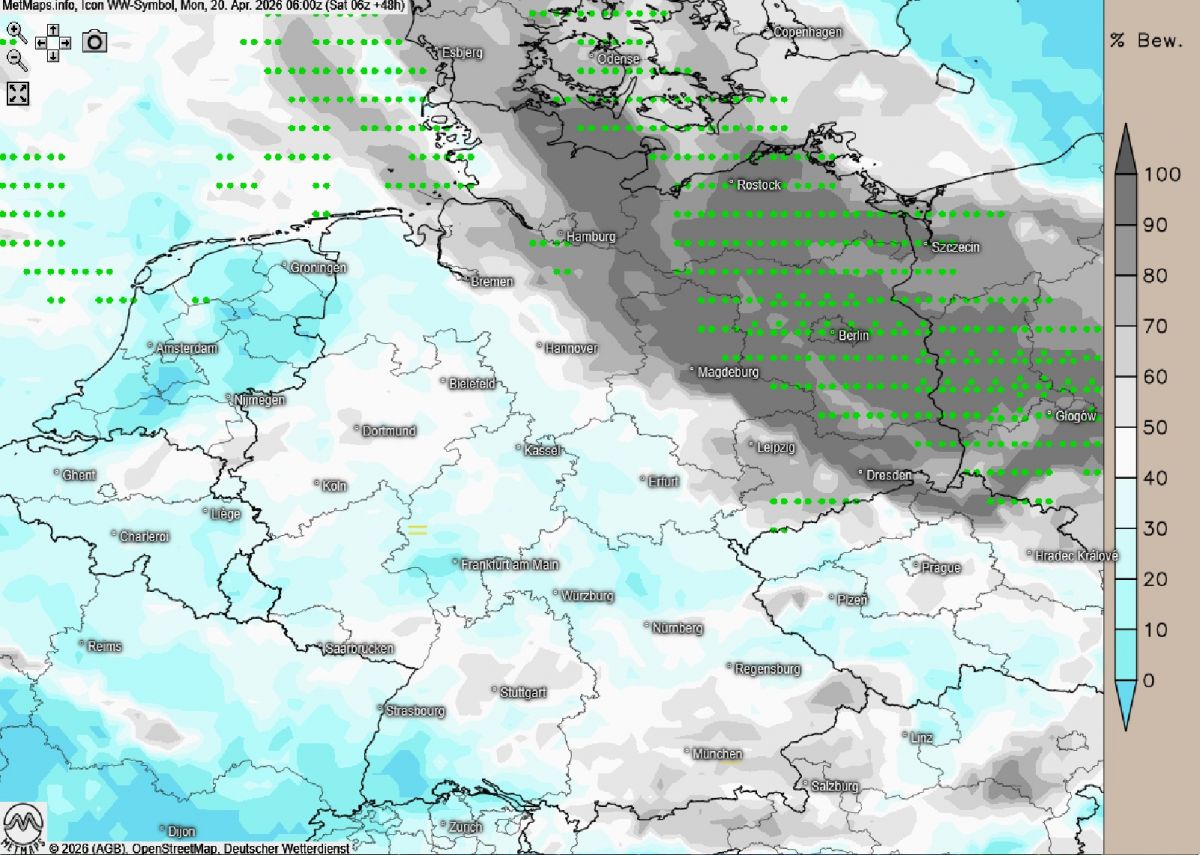 Am Montag zeigt sich der Himmel über dem Süden und Südwesten sowie später auch in Küstennähe heiter bis wolkig und es bleibt meist niederschlagsfrei. In den übrigen Landesteilen ist es zumeist bewölkt, dabei fällt von Norden über die Mitte bis in den Osten gebietsweise Regen. Auch im äußersten Süden sind einzelne Schauer und lokale Gewitter möglich.