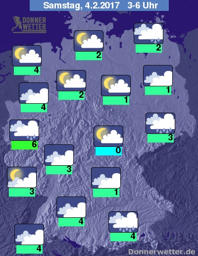 Am Samstag zieht im Südwesten aus Südwesten dichte Bewölkung und Regen auf, der sich bis zum Abend auch bis nach Bayern, Hessen und über NRW ausbreitet. Gebietsweise Regen fällt bei meist dichten Wolken auch in Vorpommern. Im übrigen Land ist es teils stärker, teils aber auch locker bis aufgelockert bewölkt und dazu trocken. Die Temperatur steigt auf 3 Grad auf Rügen und bis 8 Grad im Rheinland.