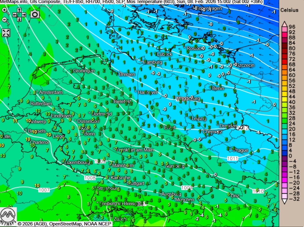 Die Temperaturen erreichen Höchstwerte um 0 auf Usedom und um 10 Grad im Rheinland.