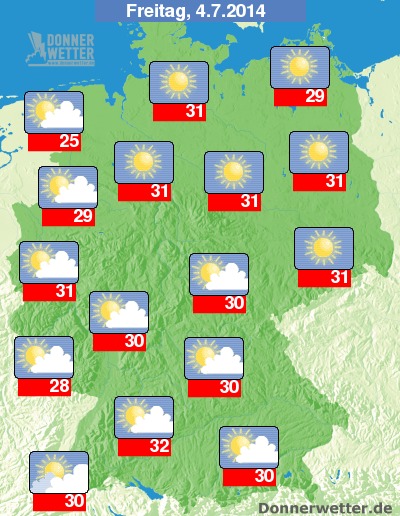 Heute können sich die meisten von uns wiederum auf einen tollen Sommertag freuen. Dabei startet der Freitag praktisch überall noch meist mit viel Sonnenschein. Von Südwesten nimmt der Wolkenanteil jedoch stetig etwas zu, und zum Nachmittag und Abend besteht nach Südwesten hin ein leichtes bis mäßiges Schauer- und Gewitterrisiko. Dagegen bleibt es in der Osthälfte des Landes bei weiterhin häufigem Sonnenschein weitgehend trocken. Die Höchstwerte erreichen 25 Grad in Emden und rund 32 Grad im Rhein-Main-Gebiet.