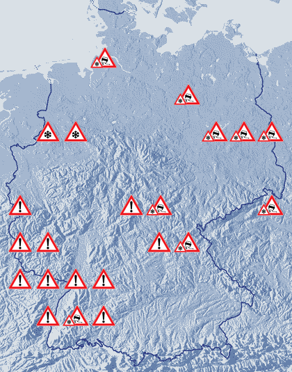 Heute Abend fällt im Süden bei weitgehend dichter Bewölkung zeitweise Regen, Schneeregen oder Schnee, dazu besteht Glättegefahr! Von der Nordsee bis nach Ostdeutschland ist es ebenfalls weitgehend bedeckt und es kann immer wieder etwas Schnee, zum Teil auch Schneeregen oder gefrierender Regen fallen, auch hier können die Straßen sehr glatt werden! In den übrigen Landesteilen ist es oft aufgelockert, teils aber auch stark bewölkt, jedoch weitgehend trocken. Die Abendtemperatur liegt bei 4 Grad im Oberrheingraben und -5 Grad in Berlin. An der Nordsee weht der Wind häufig stark.