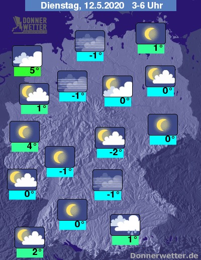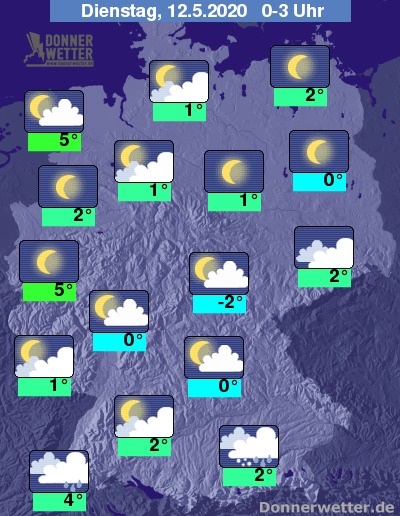 Die Temperaturen sinken in der Nacht auf Werte um 5 Grad an der Nordseeküste und um -2 Grad in Franken.