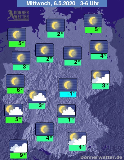 Die Temperaturen sinken bis zu den frühen Morgenstunden auf Werte um 9 Grad am Oberrhein und um -1 Grad in Franken.