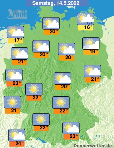 Am Samstag ist es zum Großteil heiter oder sonnig, hier und da, jedoch vor allem im Nordosten sind auch einige Wolken möglich, vereinzelte Schauer sind dann nicht ausgeschlossen, sonst bleibt es aber trocken. Die Temperatur steigt auf 16 Grad in Stralsund und bis 24 Grad in Freiburg.