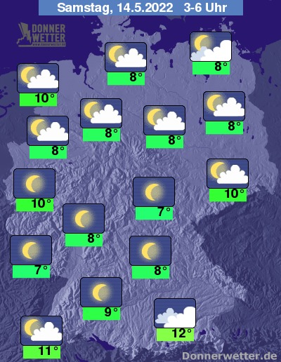 In der Nacht zum Samstag ist es über der Republik verbreitet leicht bewölkt oder sternenklar. Häufig viele und teils dichte Wolken ziehen über den Nordosten und das Alpenvorland hinweg, jedoch bleibt es auch hier trocken. Die Temperatur sinkt auf 12 Grad in München und 7 Grad in Eisenach.