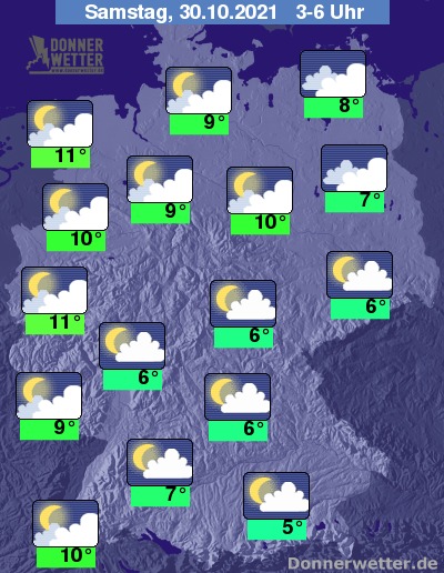 In der kommenden Nacht zeigt sich der Himmel oft wechselnd bis aufgelockert bewölkt, hier und da halten sich aber auch dichte Wolken oder es ist neblig-trüb, dazu bleibt es weitgehend trocken. Die Temperatur sinkt auf 11 Grad an der Ems und bis 5 Grad im Chiemgau.