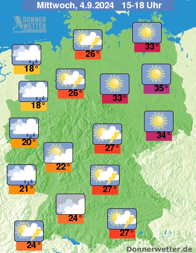 Am Mittwochnachmittag scheint die Sonne von Sachsen bis an die Ostseeküste von einem meist wolkenlosen Himmel. In den übrigen Landesteilen überwiegt am Nachmittag wechselnde oder starke Bewölkung, dabei muss im Westen und Nordwesten mit teils gewittrigem Regen gerechnet werden, sonst immer wieder Schauer und einzelne Gewitter.