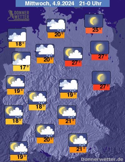 In der Nacht zum Donnerstag bleibt der Himmel über der Osthälfte sternenklar. In den übrigen Landesteilen ist es überwiegend wechselnd oder stark bewölkt und vor allem im Norden und Nordwesten sowie am Alpenrand sind in der ersten Nachthälfte noch letzte Schauer und Gewitter möglich.