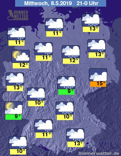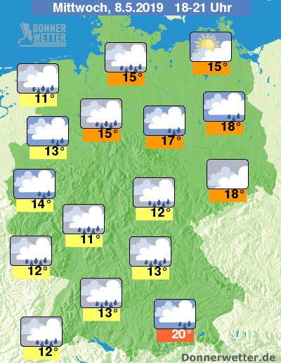 Die Temperaturen liegen am frühen Abend zwischen 11 und 15 Grad in der Südwesthälfte. In der Nordosthälfte, sowie am föhnigen Alpenrand werden noch 15 bis 20 Grad erreicht.