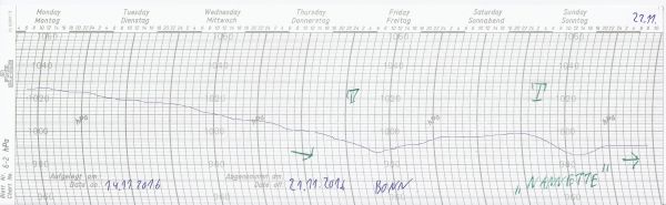 Sturmtief "Nannette" hat uns am Wochenende ordentlich durchgepustet. Unser Barographen-Schrieb der vergangenen Woche zeigt schön die sich ändernden Luftdruckverhältnisse im Wochenverlauf: