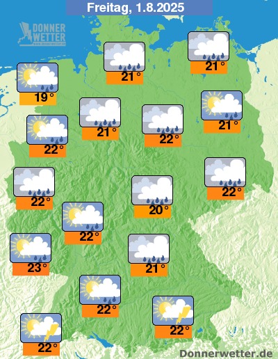 Am Freitag zieht wechselnde oder starke Bewölkung durch, dabei bilden sich zeitweise Schauer, lokal sind zudem auch Gewitter möglich. Die Temperatur steigt auf 19 Grad in Cuxhaven und bis 23 Grad in Saarbrücken.